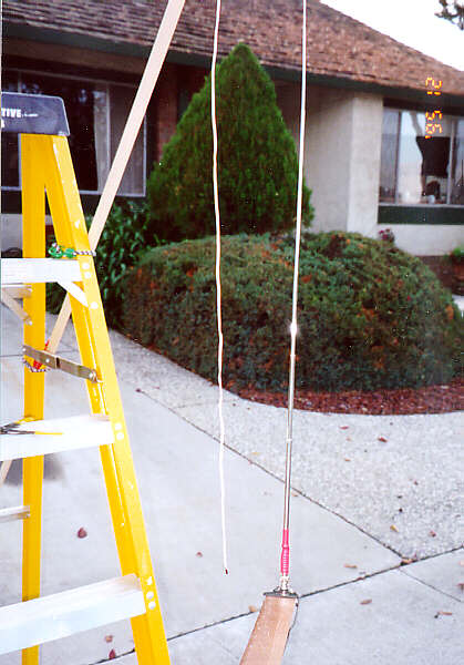 The igniter with its lead wire is hanging on the left from the stick attached to the ladder. The transmitting antenna is on the right supported by a stick I am holding in my hand.