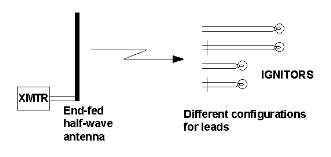 After completing these tests, I verified that the igniter I was using was good by peeling the zip cord apart and stretching the two leads in opposite directions. I then hung the igniter by one of the separated leads. This configuration was now essentially the same receiving antenna configuration as my dipole configuration in experiment one. I wanded the antenna close the the hanging igniter and it fired at a distance of approximately six inches. This assured me that the igniter I was using for experiment two was in fact a good one.