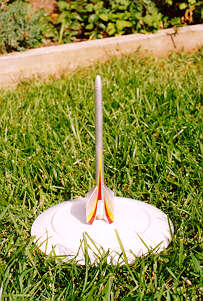 This is another tiny rocket by Estes. It's about 10 inches long. Michael and Don built it in a few minutes. It uses 1/2 A or A motors. It doesn't have a parachute. The ejection charge from the motor just pops off the nose cone which is attached to the rocket by a cord. This de-stabilizes the rocket causing it to flutter to the ground.