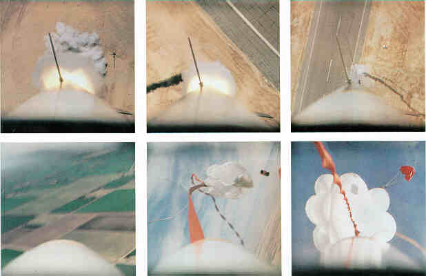 Here is Scott Bartel's six inch diameter rocket using a K550 motor and taking several photos along the way. The paved area is not a road. It is a full-size runway at the naval base where the launch was conducted, so this rocket is a lot higher than it may look.