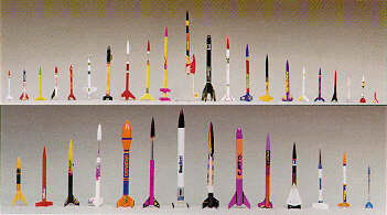 Estes is a popular brand of model rocket that can be found at most hobby stores. The little one at the right end of the upper row is only 4 inches long. Estes is best known for small model rockets, but they also make some nice rockets in the large model rocket category.